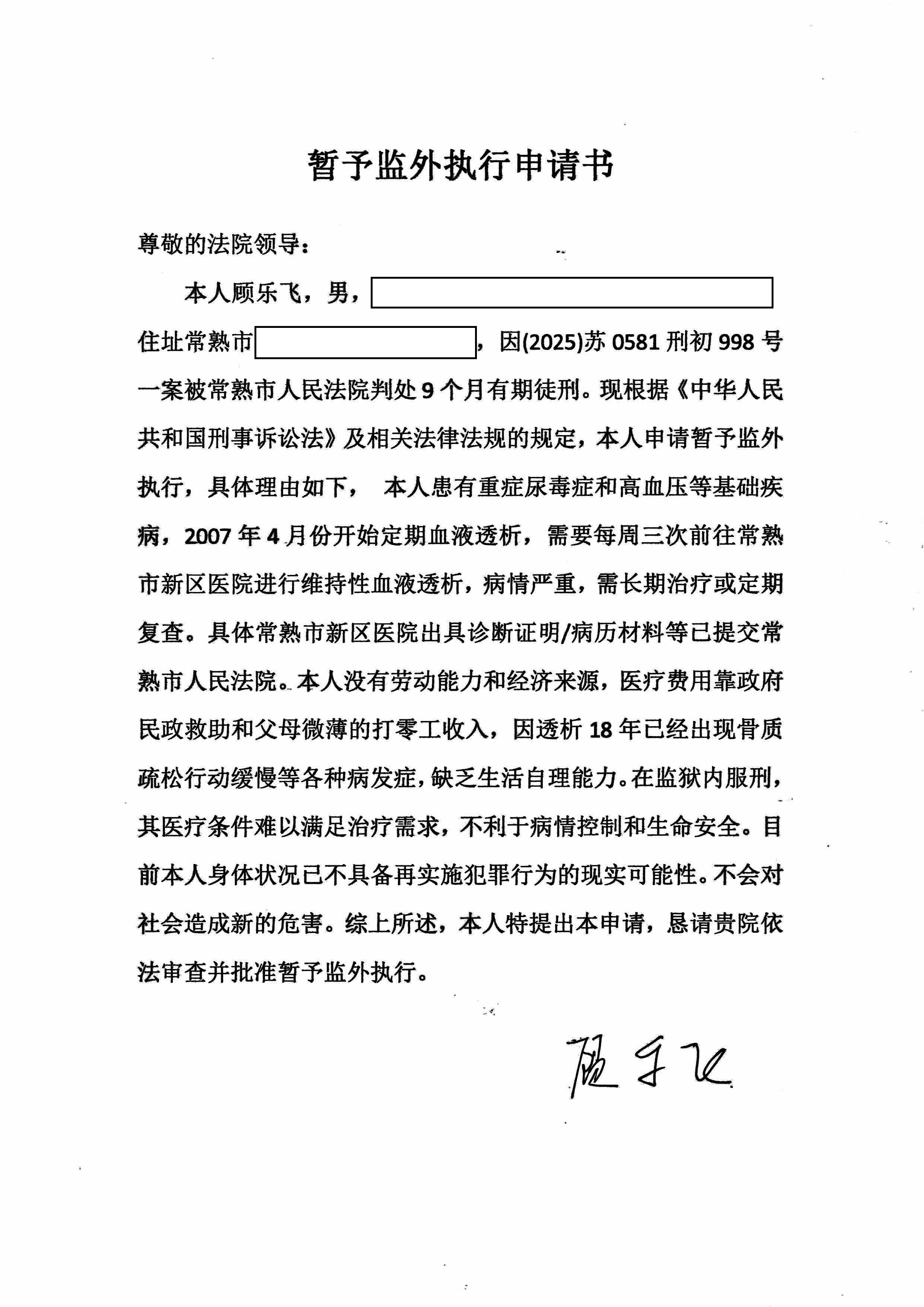 罪犯顾乐飞,男,1985年12月21日生,汉族,大学文化,无业,住江苏省常熟市。罪犯顾乐飞因犯寻衅滋事罪,于2025年11月14日被我院判处有期徒刑九个月。案件生效后,罪犯顾乐飞以其患有尿毒症等疾病为由向本院申请暂予监外执行,本院已立案受理,现将基本情况予以公示,病历诊断资料详见附件。如有意见反馈,请于公示之日起三日内向我院提出。