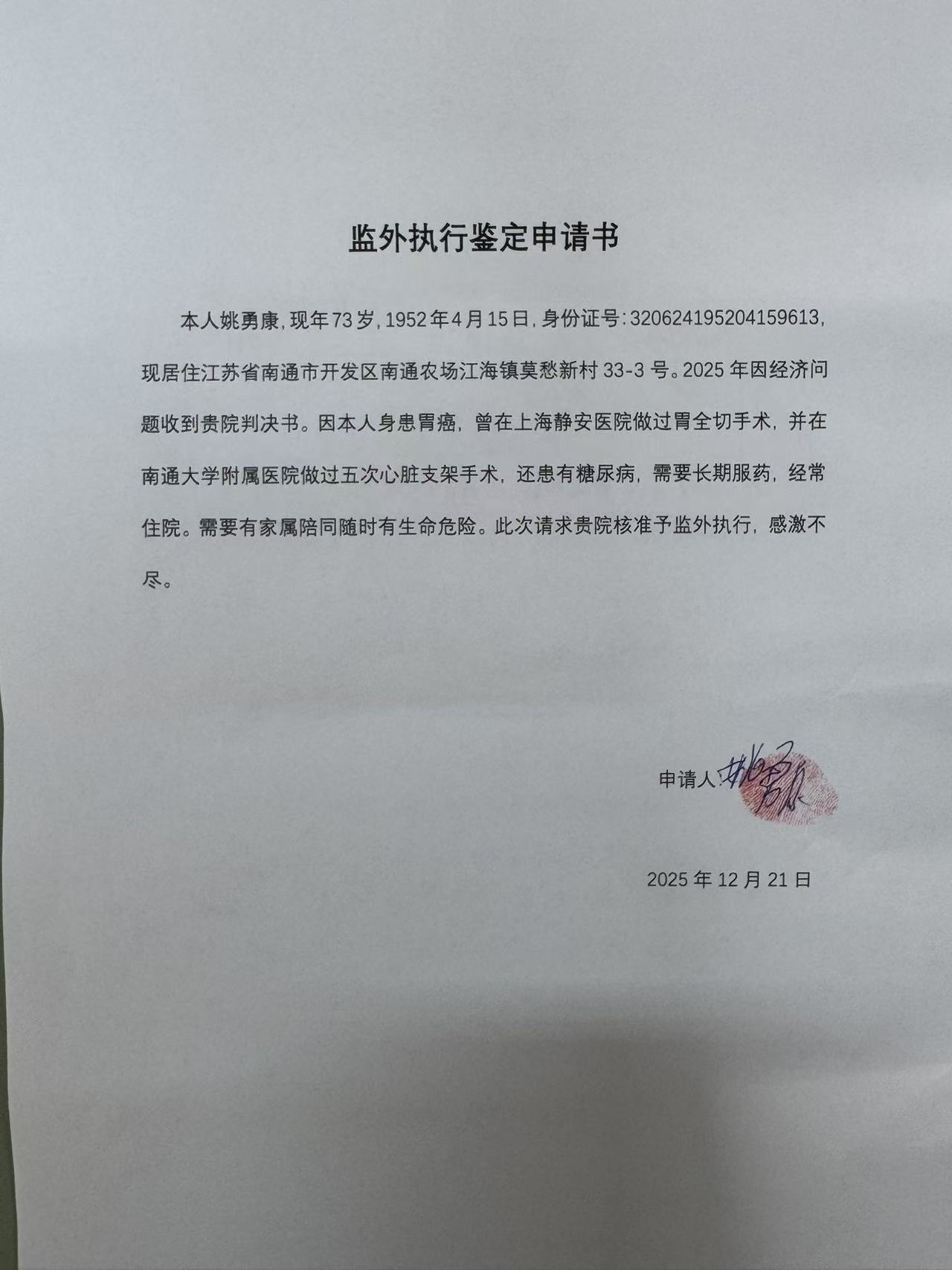判决生效后,姚勇康以患病为由提出暂予监外执行申请。本院于2026年1月5日收到申请书及相关证明材料后,认为姚勇康的情况可能符合暂予监外执行的条件,于2026年1月6日立案受理。