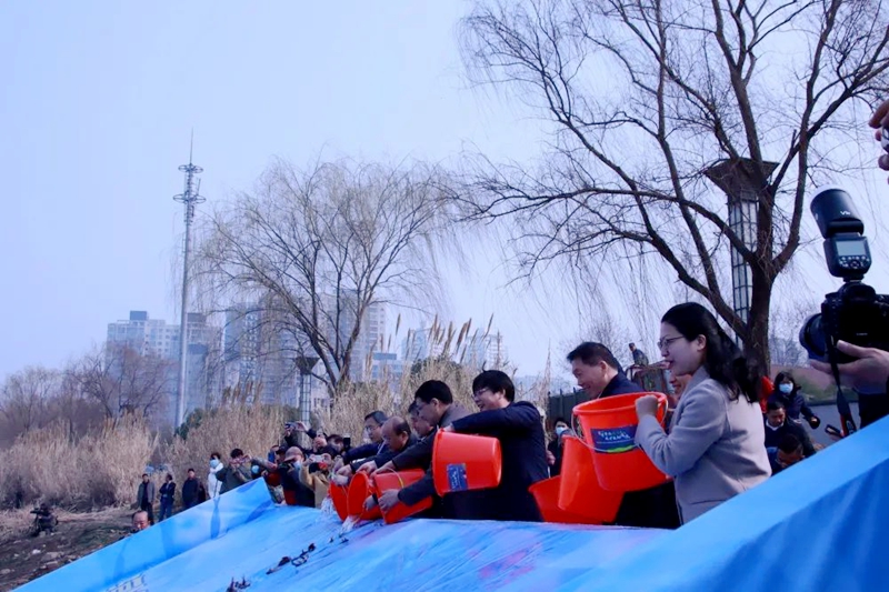在向长江投放鱼苗开展增殖放流环节,四万余尾体质健壮鱼苗经放流斜坡游入长江。现场群众扶老携幼参与其中、热情高涨。增殖放流地点系长江南京段江豚重要自然栖息地之一,江面上不时涌现长江精灵、微笑天使——江豚的身影。本次增殖放流投放的鱼苗包括胭脂鱼、长吻鮠、细鳞斜额鲴等,均系适应南京地区长江流域生存环境的珍稀鱼种,对于促进长江珍稀鱼种种群数量恢复、丰富水生生物多样性、提升长江流域生态系统稳定性具有积极意义。