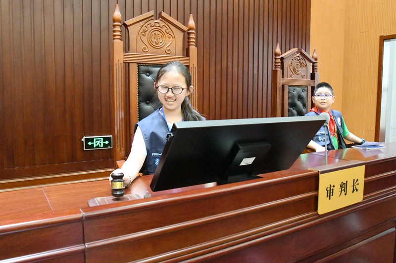 在审判法庭,孩子们详细了解了案件审判流程以及法槌、法徽的构成和象征意义,切身体验法律的严谨和庭审的庄重威严。