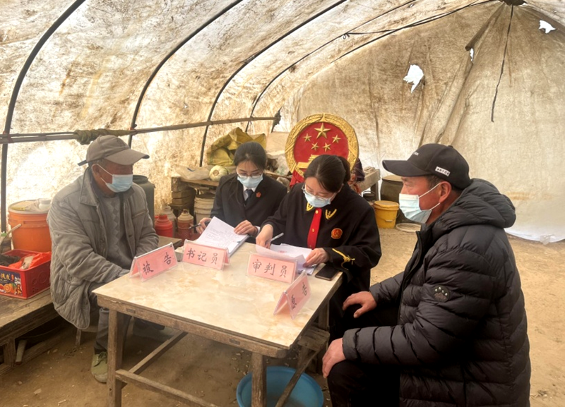 经过细致的现场勘察,侍海玲法官对于案件事实很快就有了自己的判断,并迅速就地组织庭审,一场大棚里的巡回审判就这样开始了。